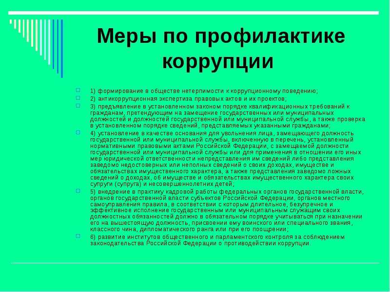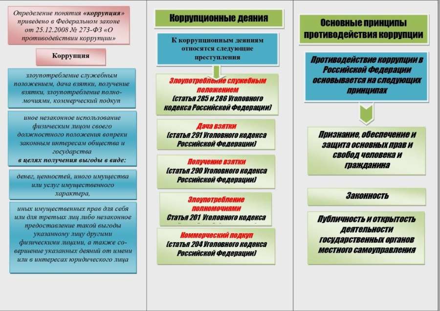 ПРОТИВОДЕЙСТВИЕ КОРРУПЦИИ25 декабря 2008 года Президентом РФ Д.А. Медведевым подписан принятый Государственной Думой и одобренный Советом Федерации Федеральный закон «О противодействии коррупции» № 273-ФЗ. Федеральный закон конкретизировал понятие коррупции как злоупотребление служебным положением, дачу взятки, получение взятки, злоупотребление полномочиями, коммерческий подкуп либо иное незаконное использование физическим лицом своего должностного положения вопреки законным интересам общества и государства в целях получения выгоды в виде денег, ценностей, иного имущества или услуг имущественного характера, иных имущественных прав для себя и для третьих лиц либо незаконное предоставление такой выгоды указанному лицу другими физическими лицами. Закон определил правовую, организационную основу и основные принципы противодействия коррупции, а также основные направления деятельности государственных органов по повышению эффективности противодействия коррупции.