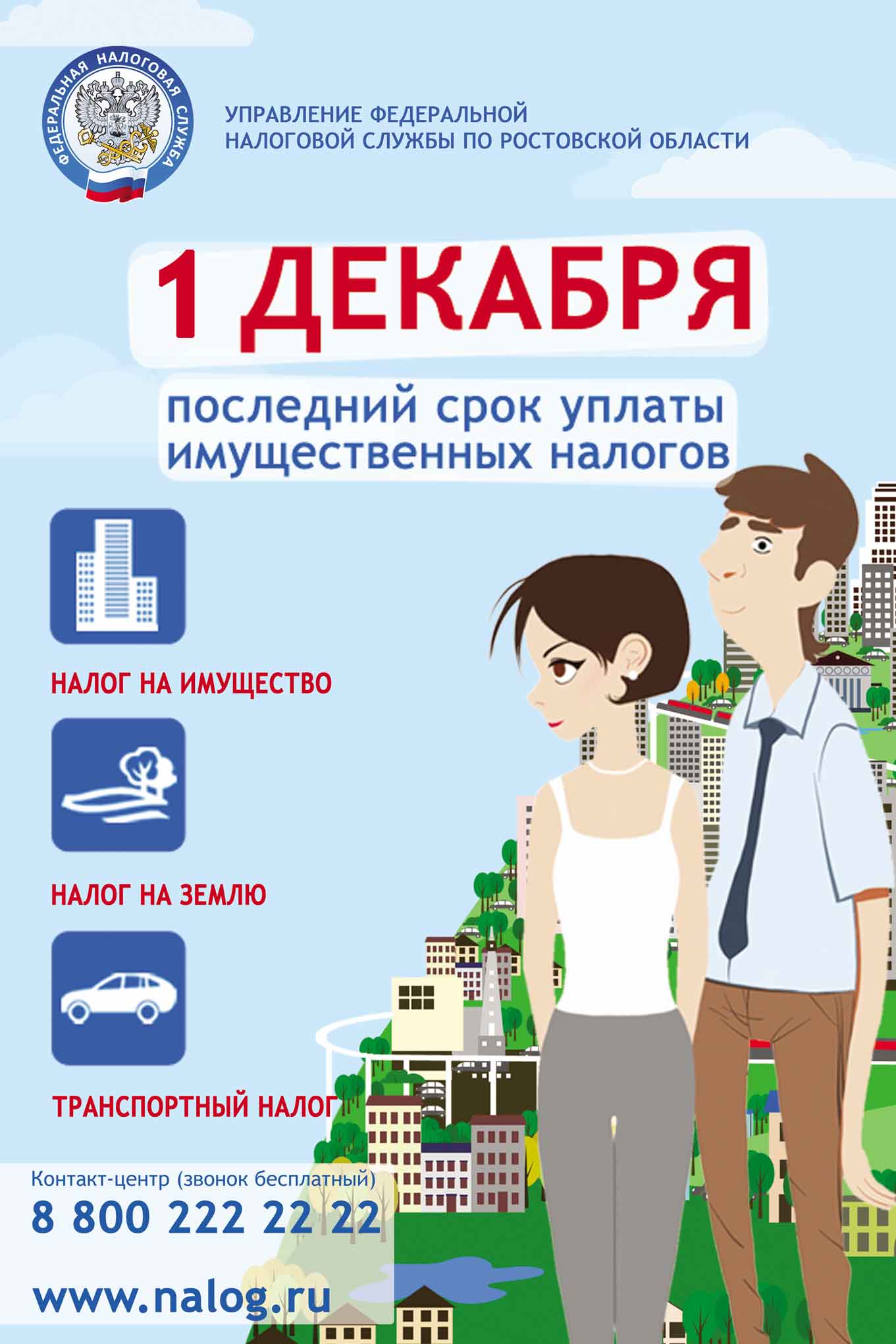 Срок уплаты имущественных налоговОпубликовано: 29-09-2020 00:00Срок уплаты имущественных налогов физическими лицами в 2020 году не позднее 1 декабря Срок уплаты транспортного, земельного налогов и налога на имущество физических лиц за 2019 год истекает 1 декабря 2020 года. Налоговое уведомление на уплату налогов направляется: - в электронном виде через интернет-сервис «Личный кабинет налогоплательщика для физических лиц»; - на бумажном носителе через отделения почтовой связи «Почта России». Пользователям «Личного кабинета» налоговые уведомления за 2019 год по почте не направляются. Налоговые уведомления также можно получить в территориальных налоговых органах. По вопросам в части кадастровой стоимости объектов недвижимости обращаться в Федеральную службу государственной регистрации, кадастра и картографии (Росреестр) (https://rosreestr.ru/site/). Способы уплаты - через платежные терминалы и банкоматы отделений банков, сервисы «Личный кабинет», «Заплати налоги» на сайте Федеральной налоговой службы www.nalog.ru, а также в отделениях «Почта России». По вопросам налогообложения, в том числе при наличии права на налоговую льготу, обращаться в инспекции по месту нахождения объектов, в Управление Федеральной налоговой службы по Ростовской области, а также по бесплатному телефону контактного центра ФНС России 8-800 222-22-22, либо воспользоваться промо-страницей «Налоговые уведомления 2020» (https://www.nalog.ru/rn61/snu2020/ ). График работы налоговых инспекций: •понедельник, среда – с 8.30 до 18.00; •вторник, четверг – с 8.30 до 20.00; •суббота (2 и 4-я каждого месяца) – с 10.00 до 15.00. Информация о ставках и льготах по транспортному, земельному налогам и налогу на имущество физических лиц размещена на Интернет-сайте ФНС России: https://www.nalog.ru/rn61/service/tax/ .