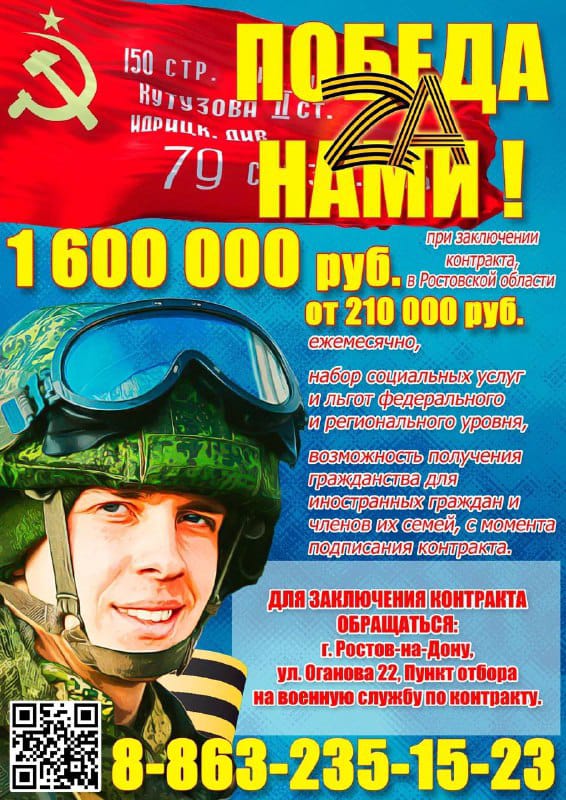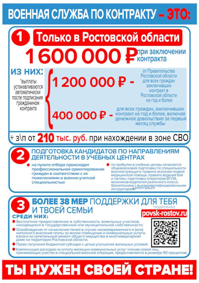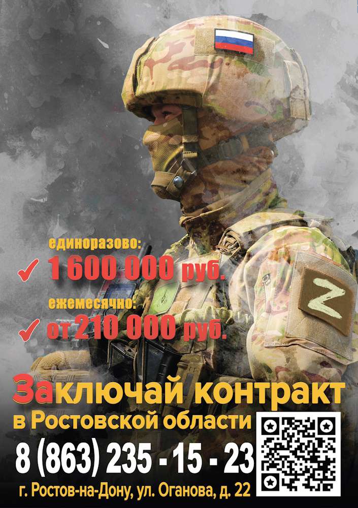 С 27 июля размер региональной выплаты для тех, кто заключает контракт о прохождении военной службы на территории Ростовской области, составляет 1,2 мл. рублей. Размер денежного довольствия после заключения контакта – от 210 тысяч рублей ежемесячно. По вопросам службы по контракту звоните 8 (863) 235-15-23 или по круглосуточному бесплатному номеру 117. ![]() ![]() ![]()